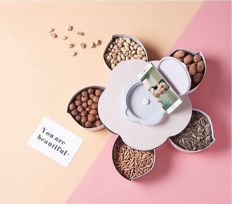 Khay mứt xoay hình cánh hoa kèm giá đỡ vừa đựng được mứt kẹo lại còn thiết kế để điện thoại rất tiện dụng